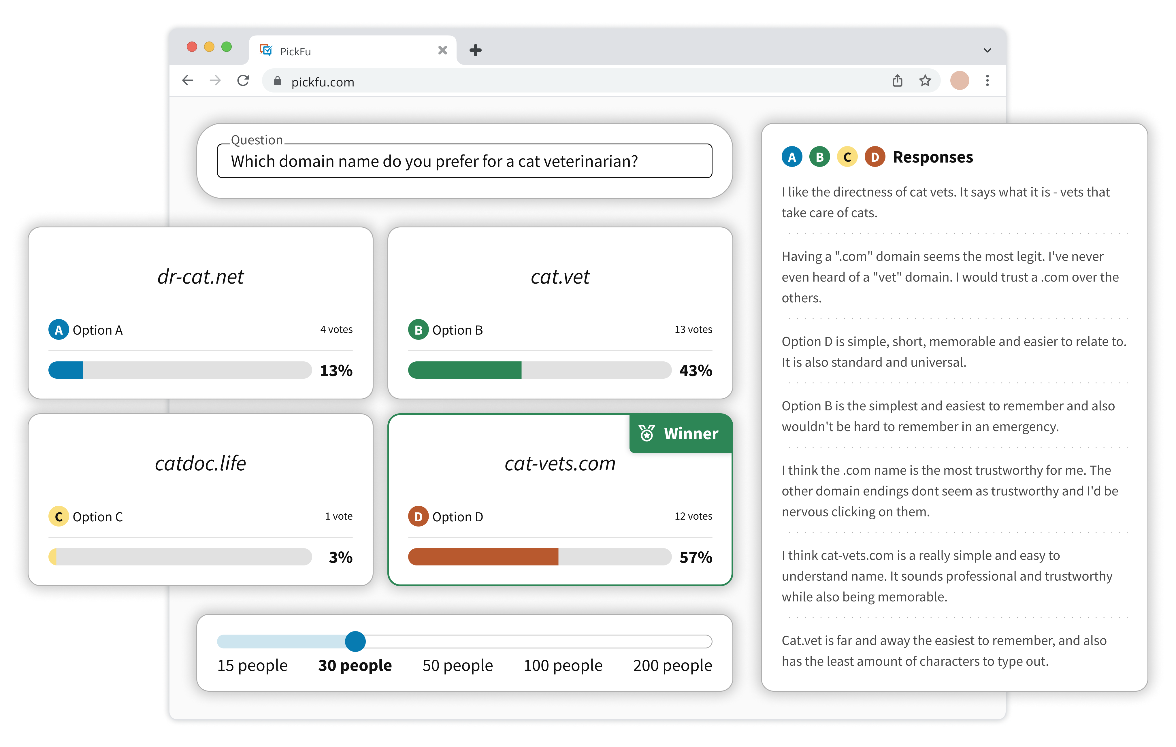 PickFu is for anyone who wants to gather feedback from the people that matter most to their business. Customers across industries like e-commerce, mobile gaming, marketing, and publishing use PickFu to optimize product listings, websites, mobile game trailers, book titles, brand logos, ads, and more – the possibilities are endless.