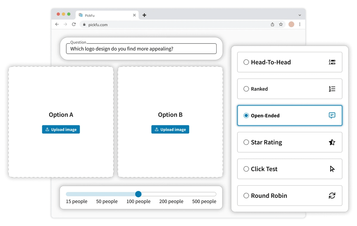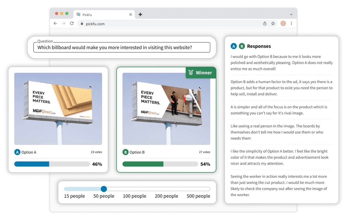 ¿Estás creando una publicidad para veinteañeros? ¿O quizá un juego móvil dirigido a padres y madres? ¿O un libro para inversores de criptomonedas? Sin importar en qué tipo de proyecto estés trabajando, PickFu te facilita la tarea de preguntar a tus consumidores objetivo si lo estás haciendo bien. Cuanto antes comiences a recopilar sus opiniones, más confianza sentirás cuando te lances al mercado.