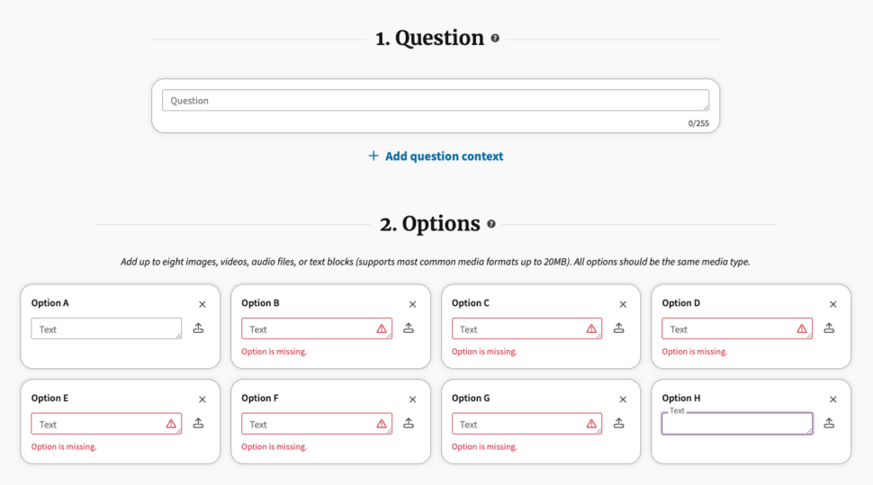 You can give poll respondents options to vote between or rank, including images, plain text (up to 1,000 characters), a URL, or a video or audio file. With PickFu surveys, you can ask the same audience up to eight questions, mixing and matching question formats based on your needs. You can also provide additional context for the audience to consider when answering your question.