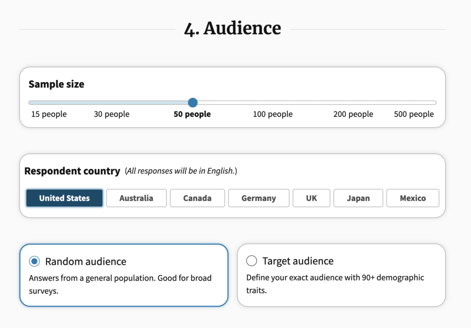 Next, choose your audience type and size. A baseline 50-person poll starts at $1 per respondent, depending on targeting and demographics.