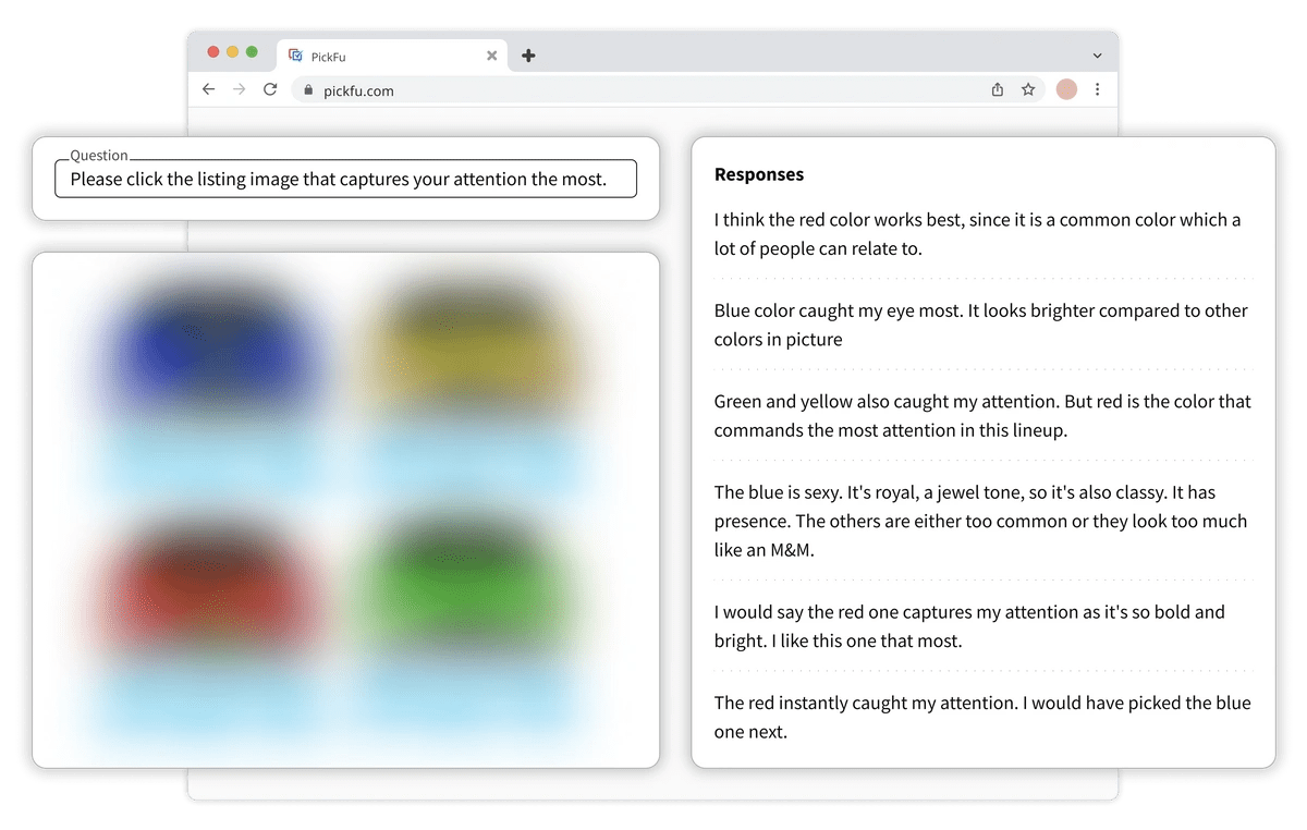 "I’ve never had a way to get immediate feedback from real potential buyers like I can with PickFu. It makes a huge difference to our product listings’ rankings and conversions."