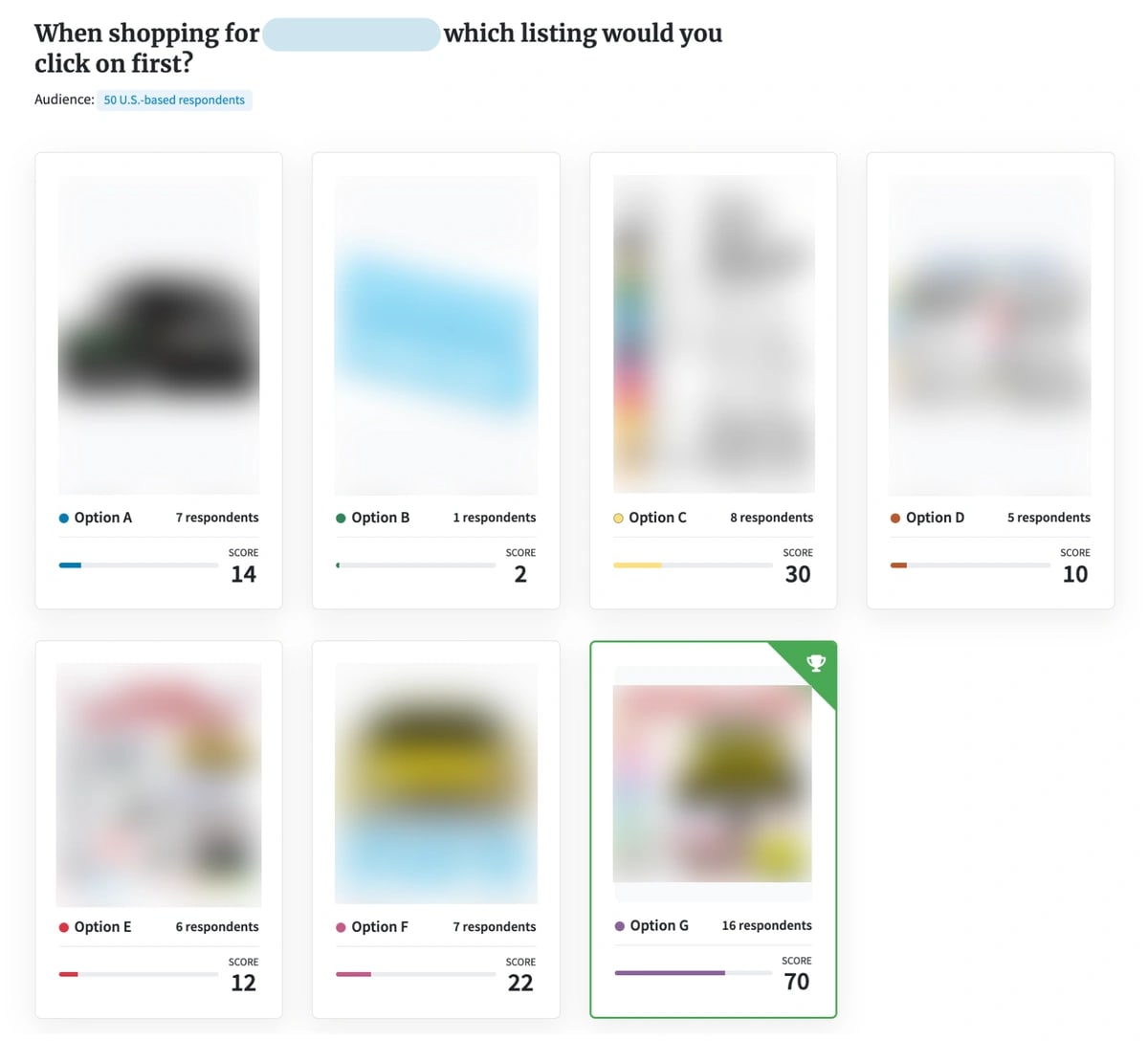 1) Jeff simulated a search results page using his client’s and their top competitors’ main images, and asked respondents (a panel of US-based Amazon Prime members) which image they would click on first when shopping for the product. As expected, respondents overwhelmingly clicked on the competition’s main images instead of his client’s.