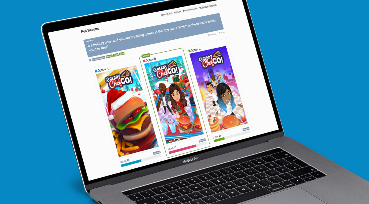 Mojiworks periódicamente testea recursos creativos clave usando PickFu. Esto incluyó las ideas de iconos y mosaicos para su lanzamiento navideño del 2020: Jingle Burgers, con un público objetivo que refleja su base de jugadores de la vida real, predominantemente femenina.