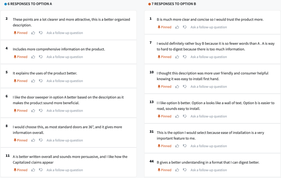 If respondents didn’t choose your product, why did they prefer the competition? Did they like the capitalization of the benefits? The use of bullet points? Inclusion of details that you left out?