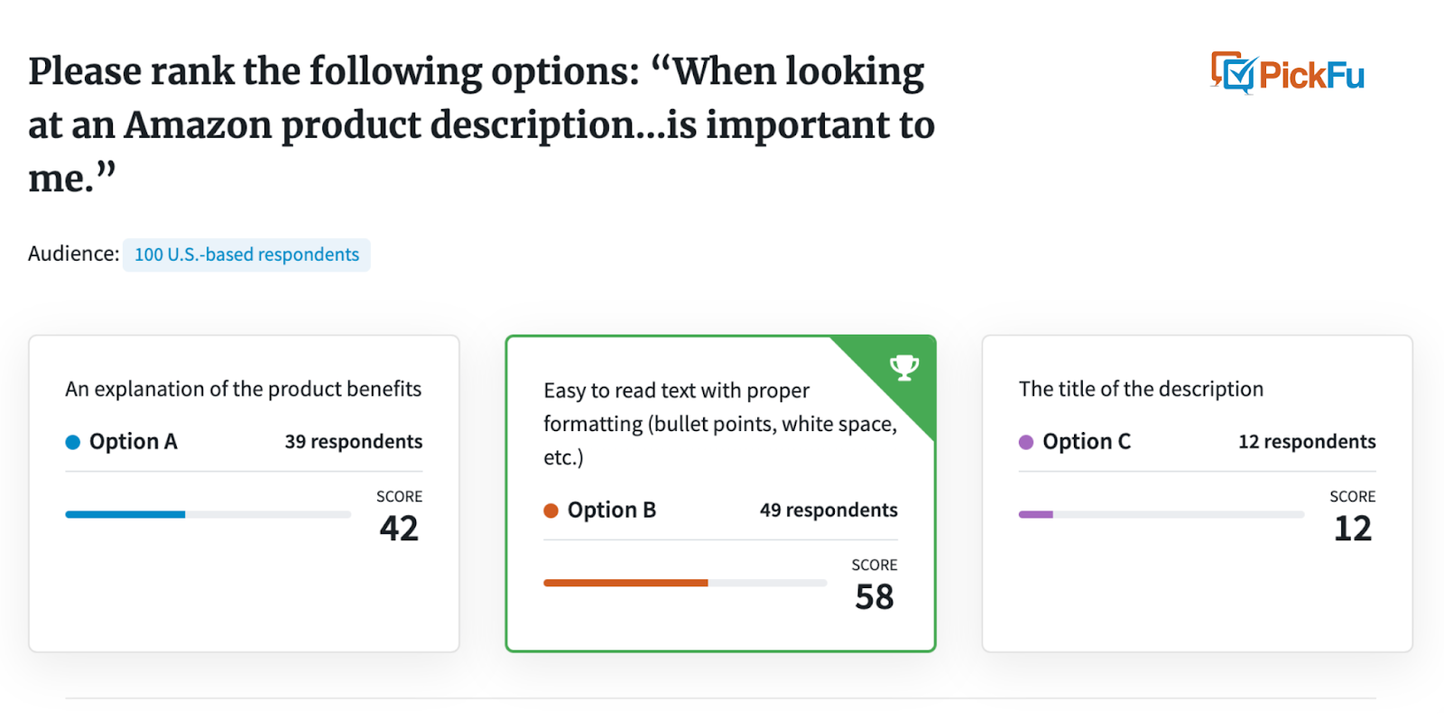 A consumer research tool like PickFu is excellent for this. You can A/B test your title or description against your competitors with real Amazon customers. Then you can use the findings to improve your listing.