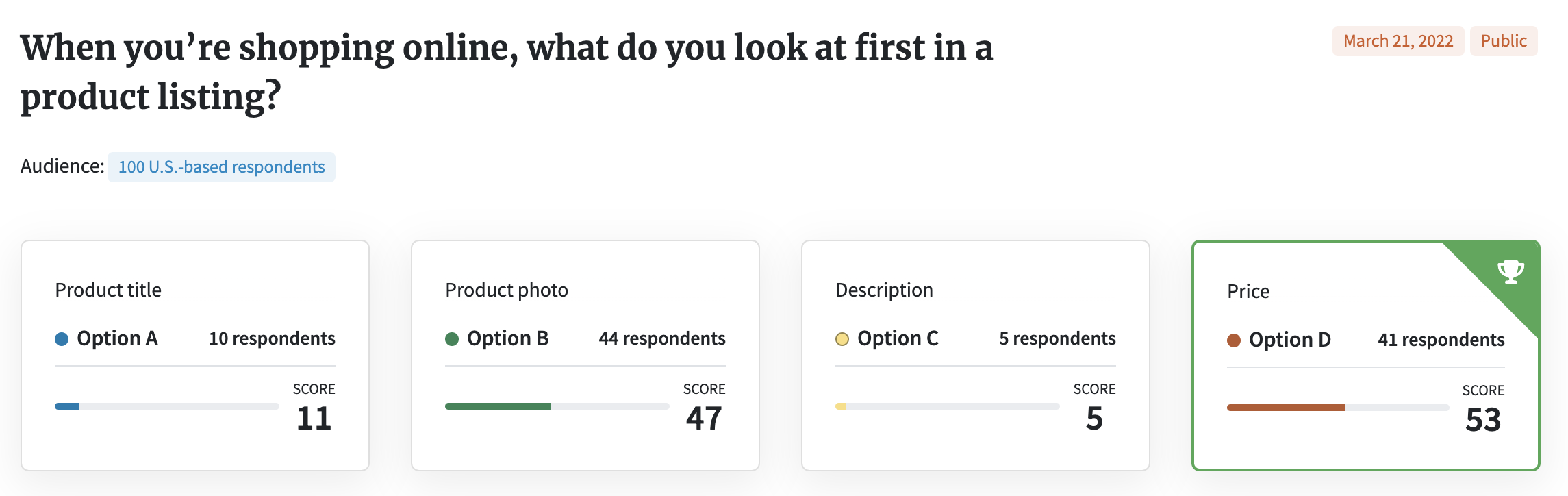 We asked them to rank four elements of a product listing — product title, photo, description, and price — in order of which one catches their eye.